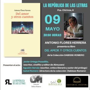 Nos complace anunciar que el próximo viernes 9 de mayo a las 20:00 horas tendrá lugar la presentación de Del amor y otros cuentos, el nuevo título de Antonio Flores Herrera, dentro de la Colección «Dabisse-Romero», editada y publicada por Editorial Anáfora, y al frente de cuya dirección está la poeta y gestora cultural Isabel Romero. La obra se presentará en La República de las Letras (Plaza Chirinos, 6), en la ciudad de Córdoba, en un acto abierto al público y con entrada libre hasta completar aforo.